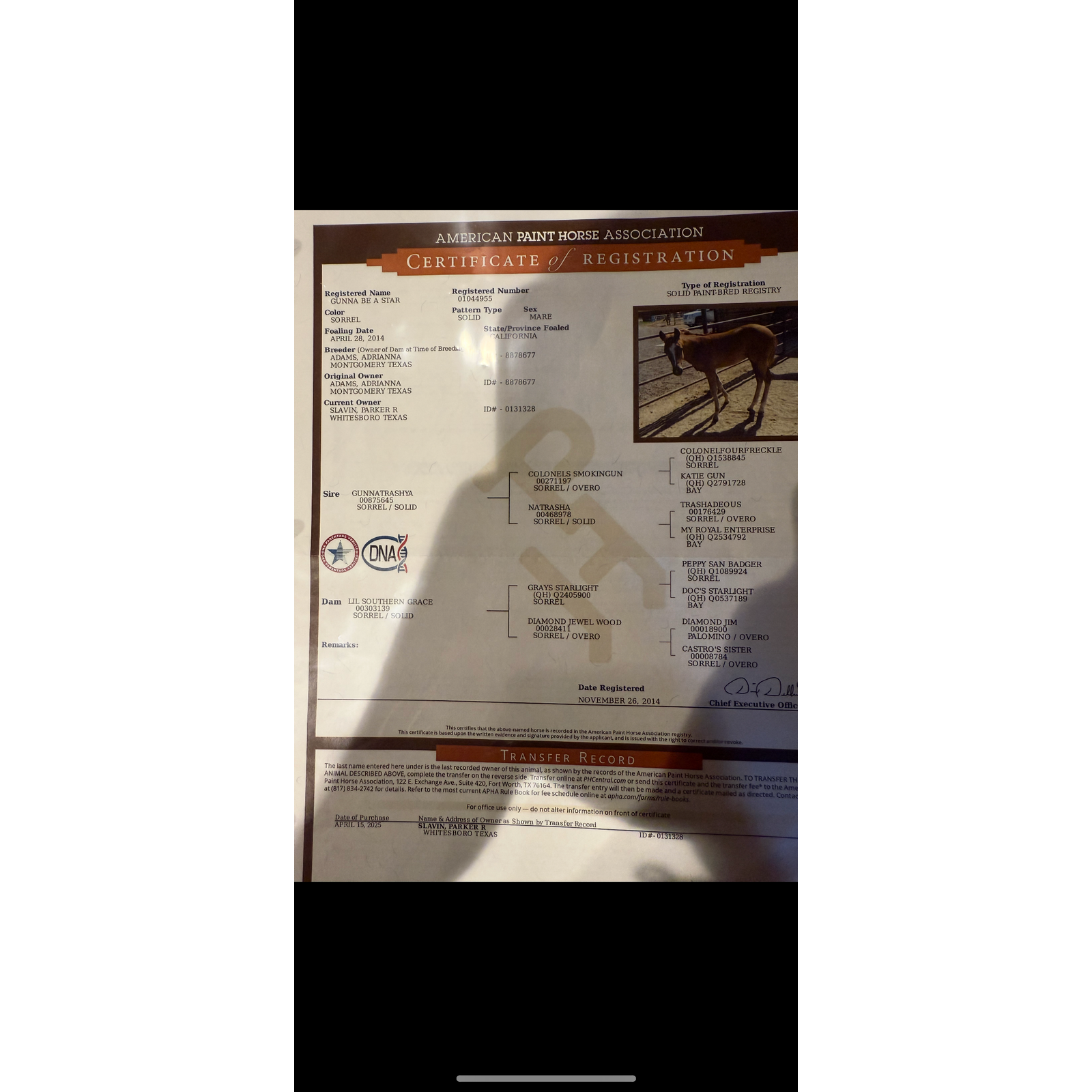 A 2014 APHA mare by the great $16M producing stallion “GUNNATRASHYA” out of a daughter of “GRAYS STARLIGHT”. Ms Kitty stands 15.0HH, stands stout, and has also produced two foals on record as well as won over $1,000 in the NRHA. She is a proven producer with her foals already winning over $7000 in the reining.